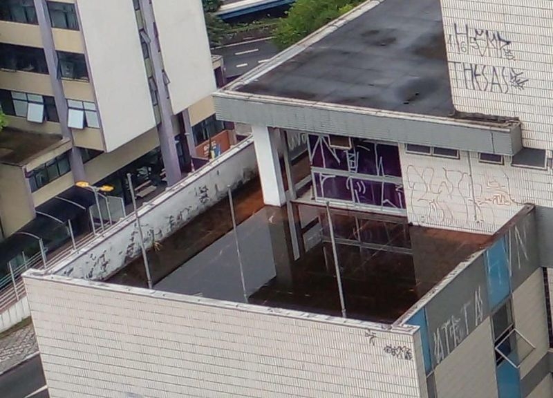 O antigo prédio da Telefônica, localizado na esquina da Avenida Portugal e Rua Justino Paixão, no Centro de Santo André, está desativado e fechado, mas tem acumulado água parada no último andar, intensificando o risco.
