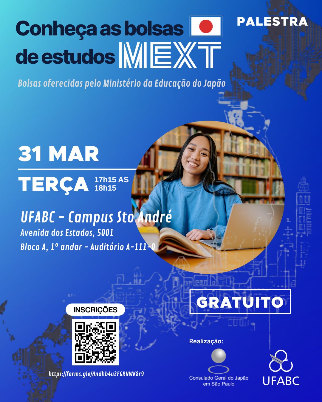 O Consulado-Geral do Japão em São Paulo realizará uma palestra explicativa sobre as bolsas de estudo oferecidas pelo Ministério da Educação, Cultura, Esporte, Ciência e Tecnologia do Japão (MEXT). O evento acontece na terça (31), na UFABC – Campus Santo André.