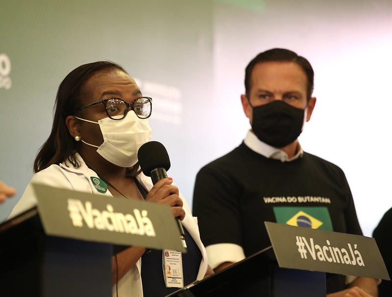 O governador João Doria, nesta sexta (12) de fevereiro, em coletiva de imprensa, acompanhou a aplicação da 2ª dose da Coronavac em Mônica Calazans, enfermeira da UTI do Instituto de Infectologia Emílio Ribas e a primeira brasileira vacinada contra o coronavírus.